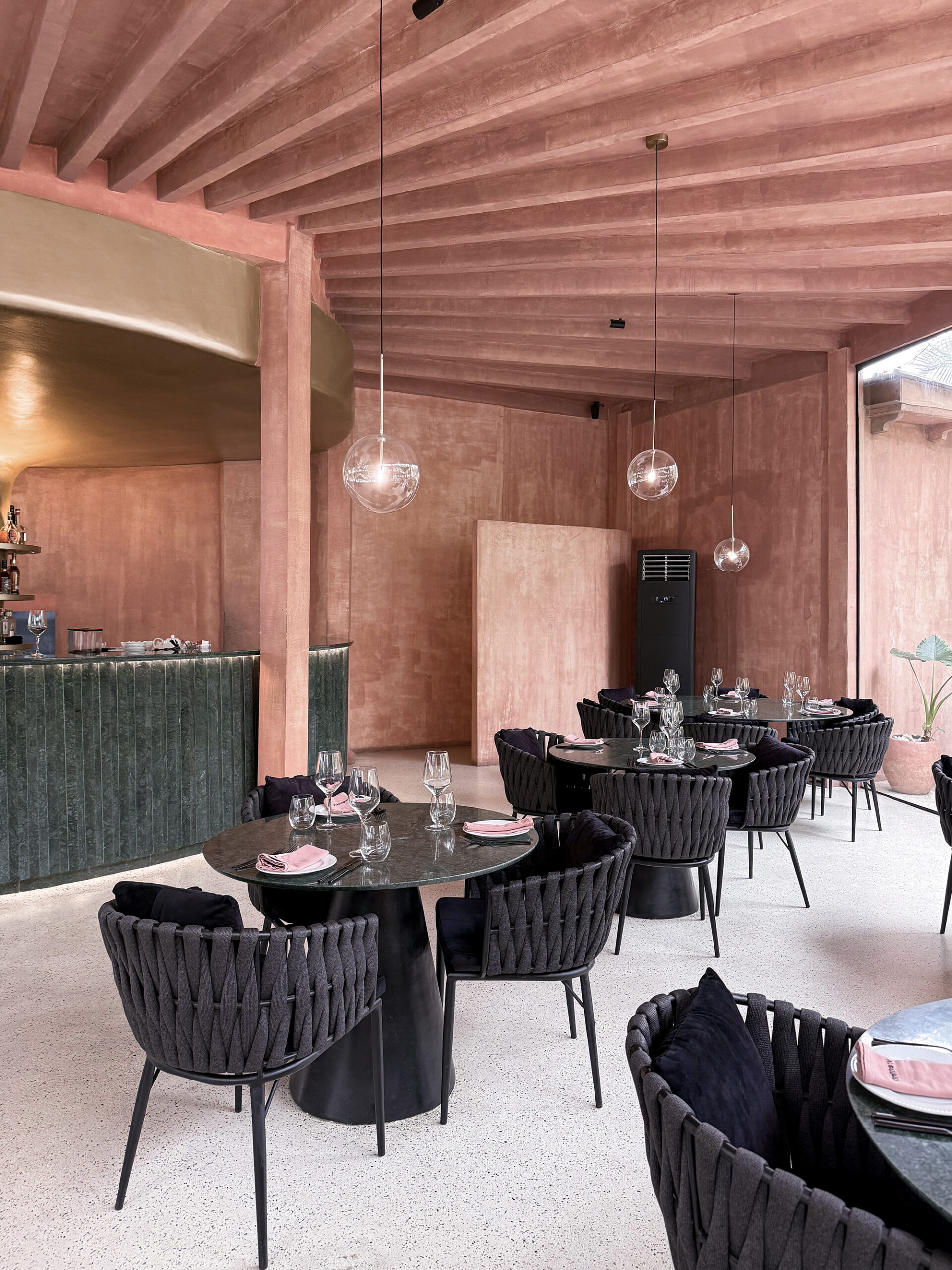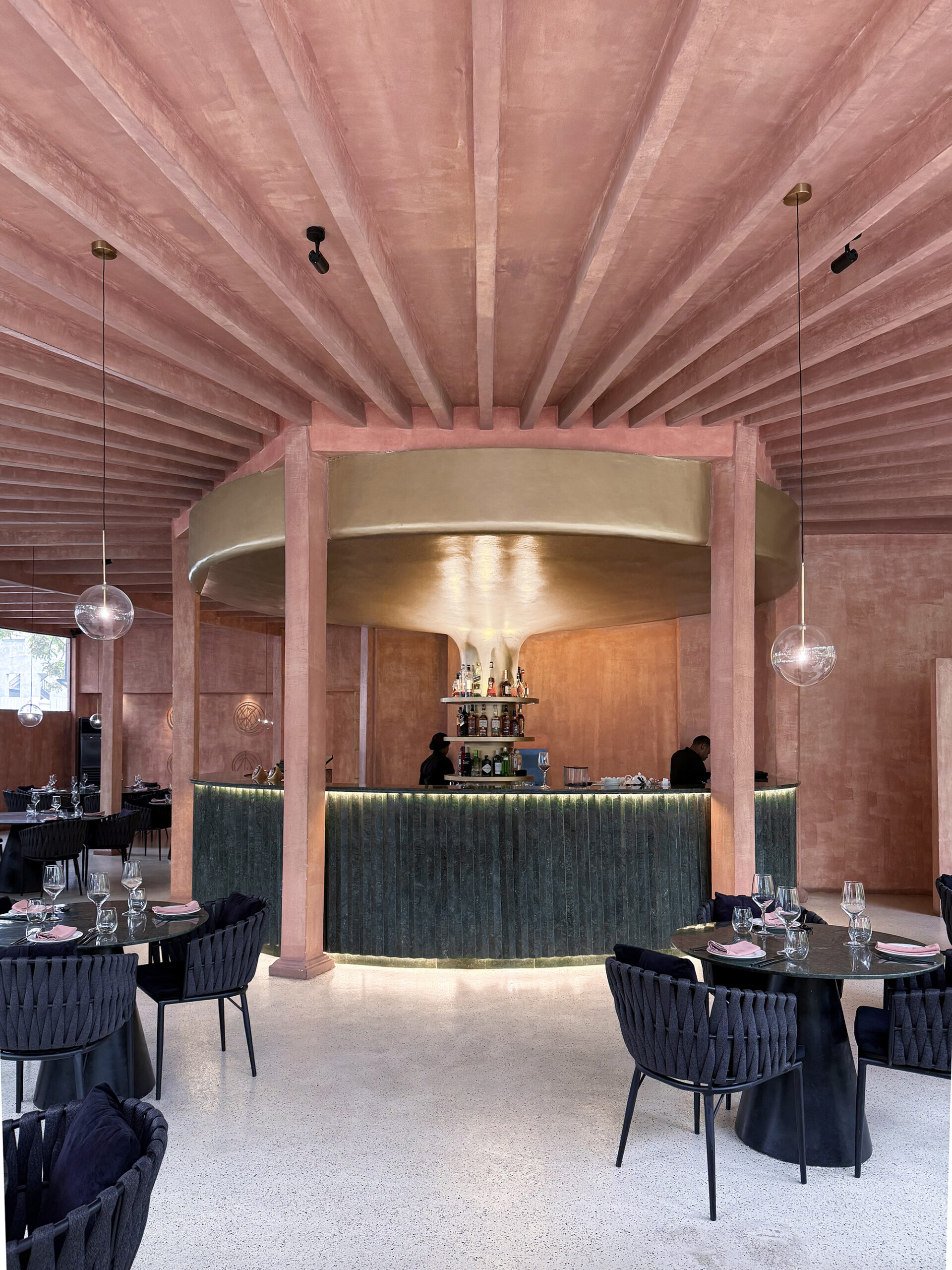 In the centre of the dining room bar, a geometric shape appears that opens onto the ceiling, reminiscent of Angola’s national tree – the baobab. The golden baobab evokes the intense, warm sunlight of Angola and its mineral wealth – rich in ores and gold; the pink marmorino applied to the walls of the restaurant, as well as the furniture, made of local ironwood, take us back to its unique natural landscapes, rich in fauna and flora.