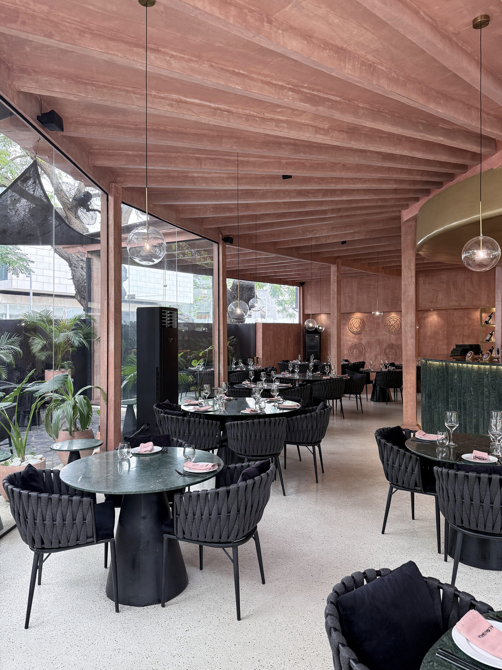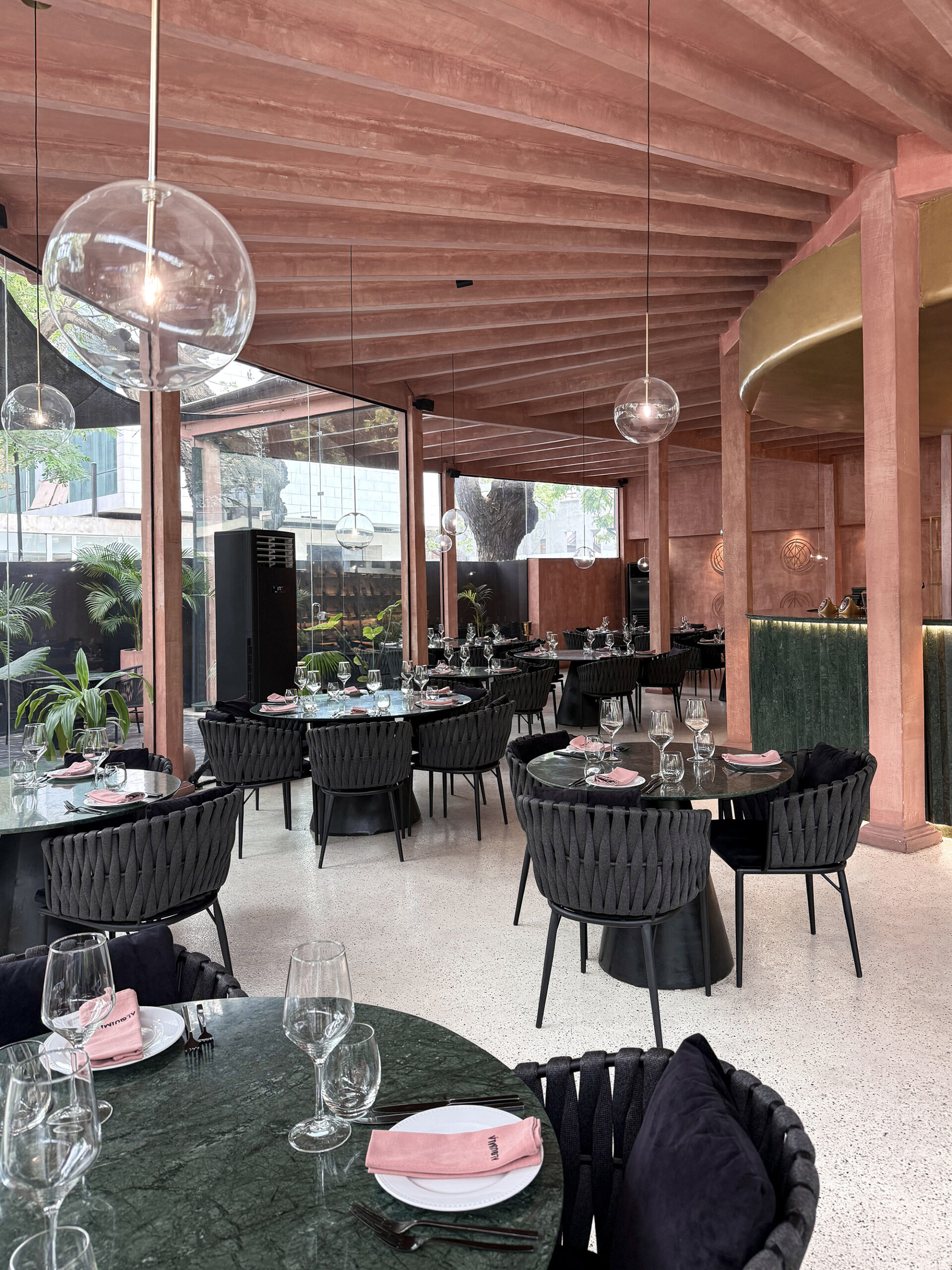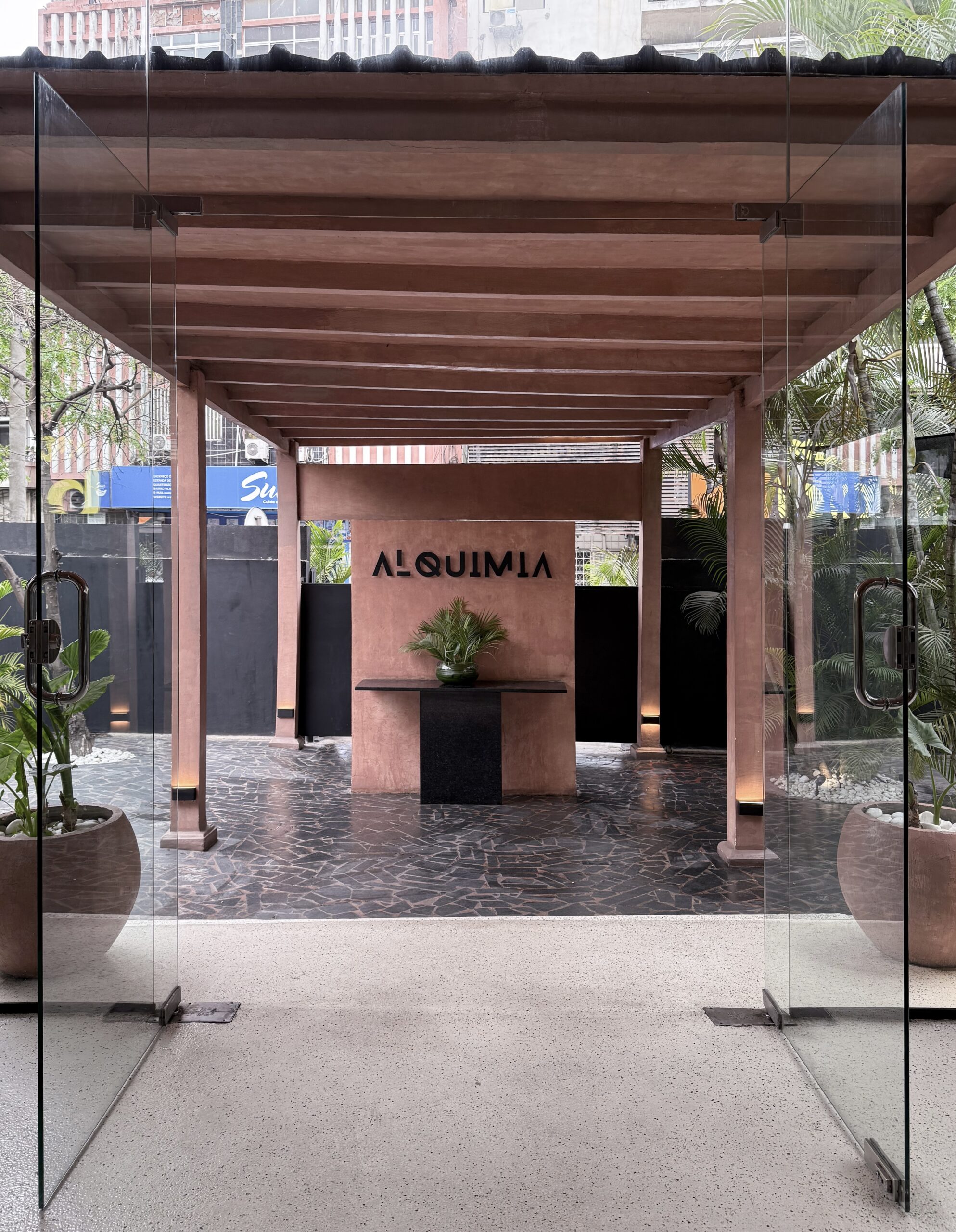 The palette of colours used for the renovation of the ALQUIMIA restaurant was inspired by Angola. The pink earth, rich in iron, and the lush vegetation, rich in its palette of greens and browns, defined the chromatic tones for the restaurant. The aim was to propose an interior architecture that maintained the colonial lines of the 1960s building, characterised by the structure of wooden pillars, beams and joists, and the central marble pillar that organises and defines the elliptical layout of the restaurant. Currently open, as if it were a large porch, the idea was to enclose the elliptical structure of the dining room in order to provide it with air conditioning and offer a higher quality environment.