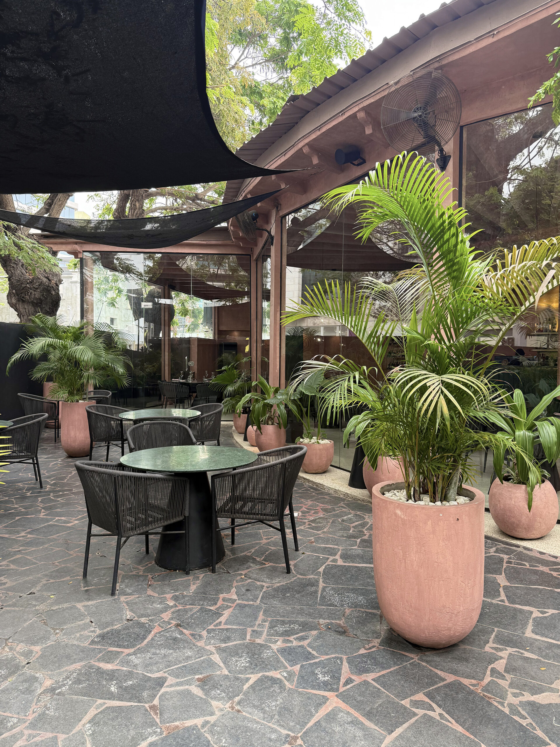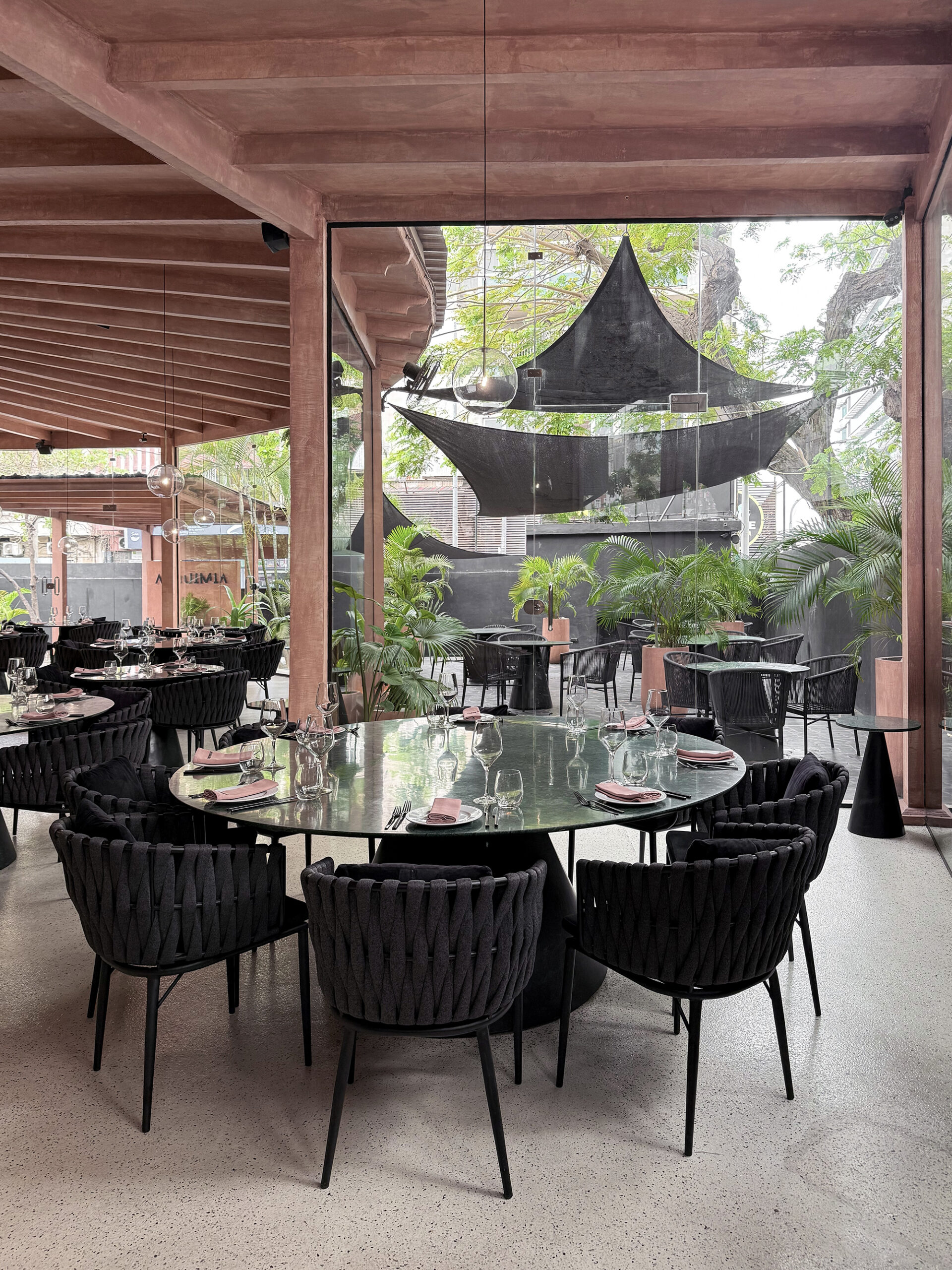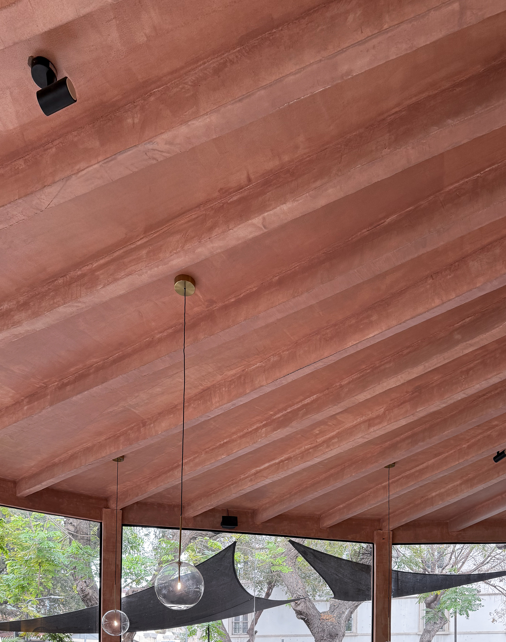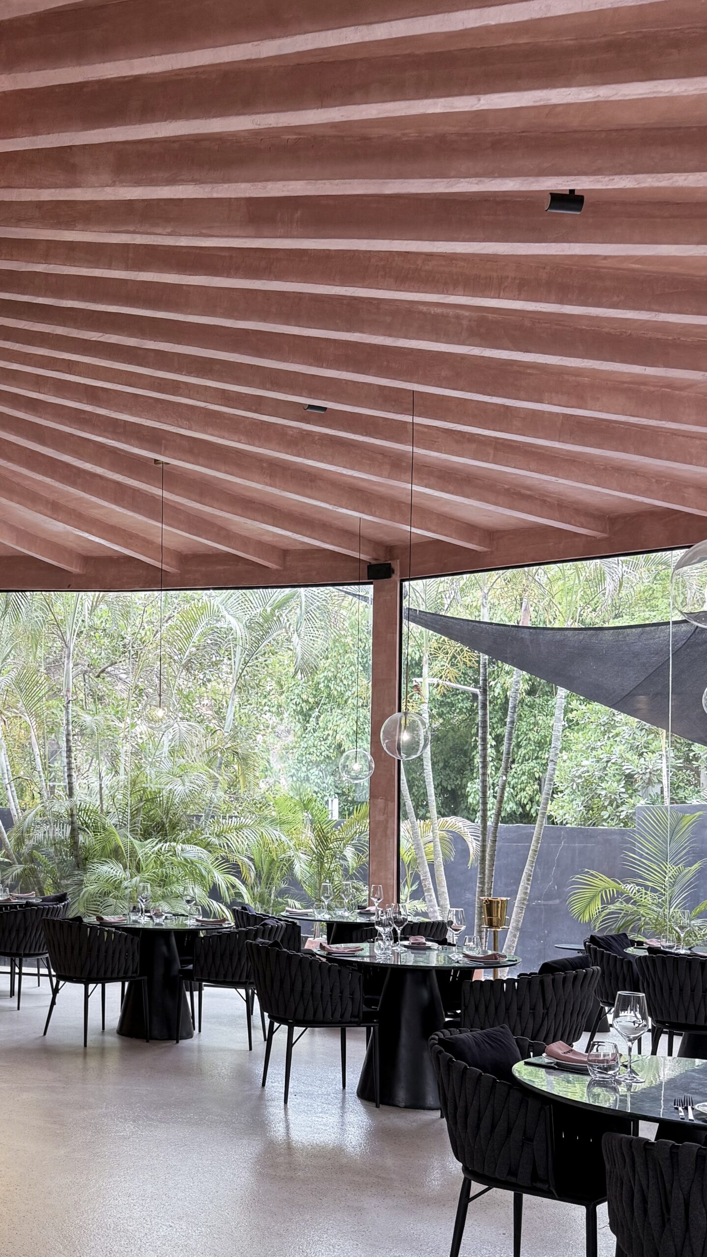 The palette of colours used for the renovation of the ALQUIMIA restaurant was inspired by Angola. The pink earth, rich in iron, and the lush vegetation, rich in its palette of greens and browns, defined the chromatic tones for the restaurant. The aim was to propose an interior architecture that maintained the colonial lines of the 1960s building, characterised by the structure of wooden pillars, beams and joists, and the central marble pillar that organises and defines the elliptical layout of the restaurant. Currently open, as if it were a large porch, the idea was to enclose the elliptical structure of the dining room in order to provide it with air conditioning and offer a higher quality environment.