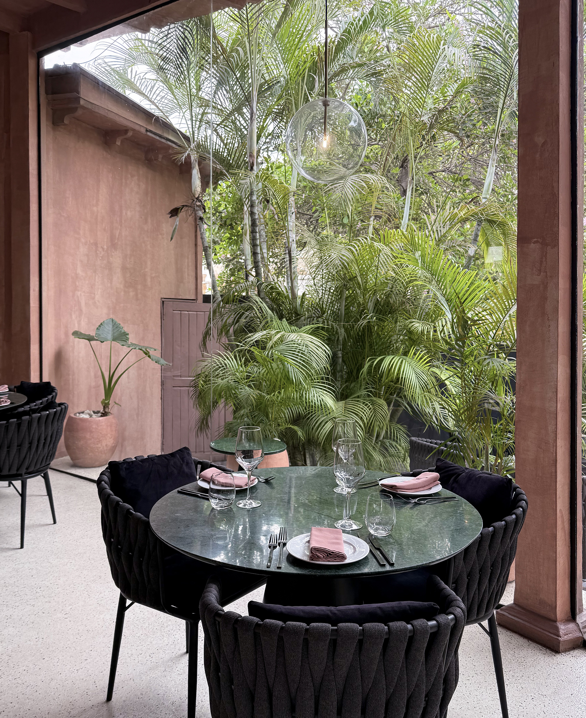 The new interior design invokes sophistication without ostentation. The lightness of the materials used – marble flooring, marmorino on the walls and high-gloss brass sheet – and the care taken in selecting the colours, evoke a stunning, natural and glamorous Angola. The restaurant is bordered by areca palm trees, philodendrons and heliconias. The symbiosis between the interior and exterior is created in a very natural and subtle way, with only simple glass separating the garden and the dining room.