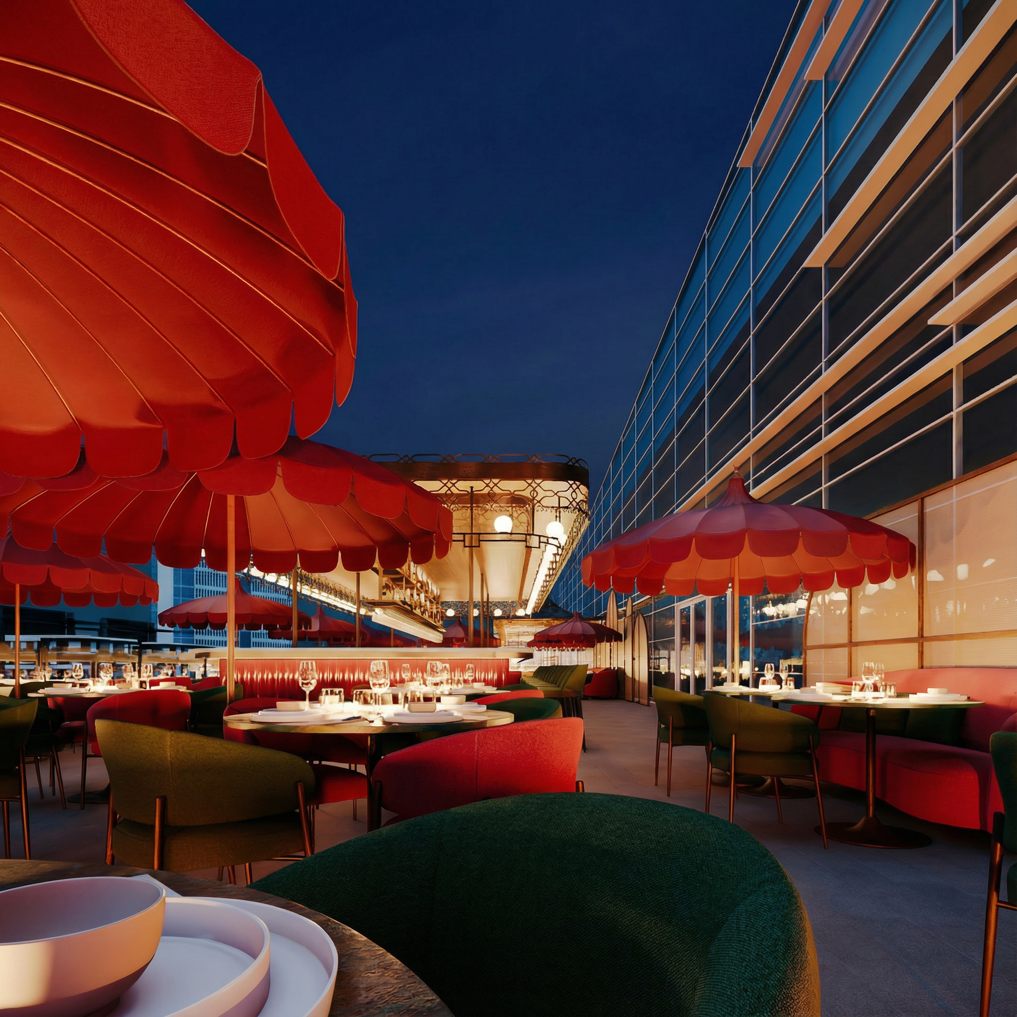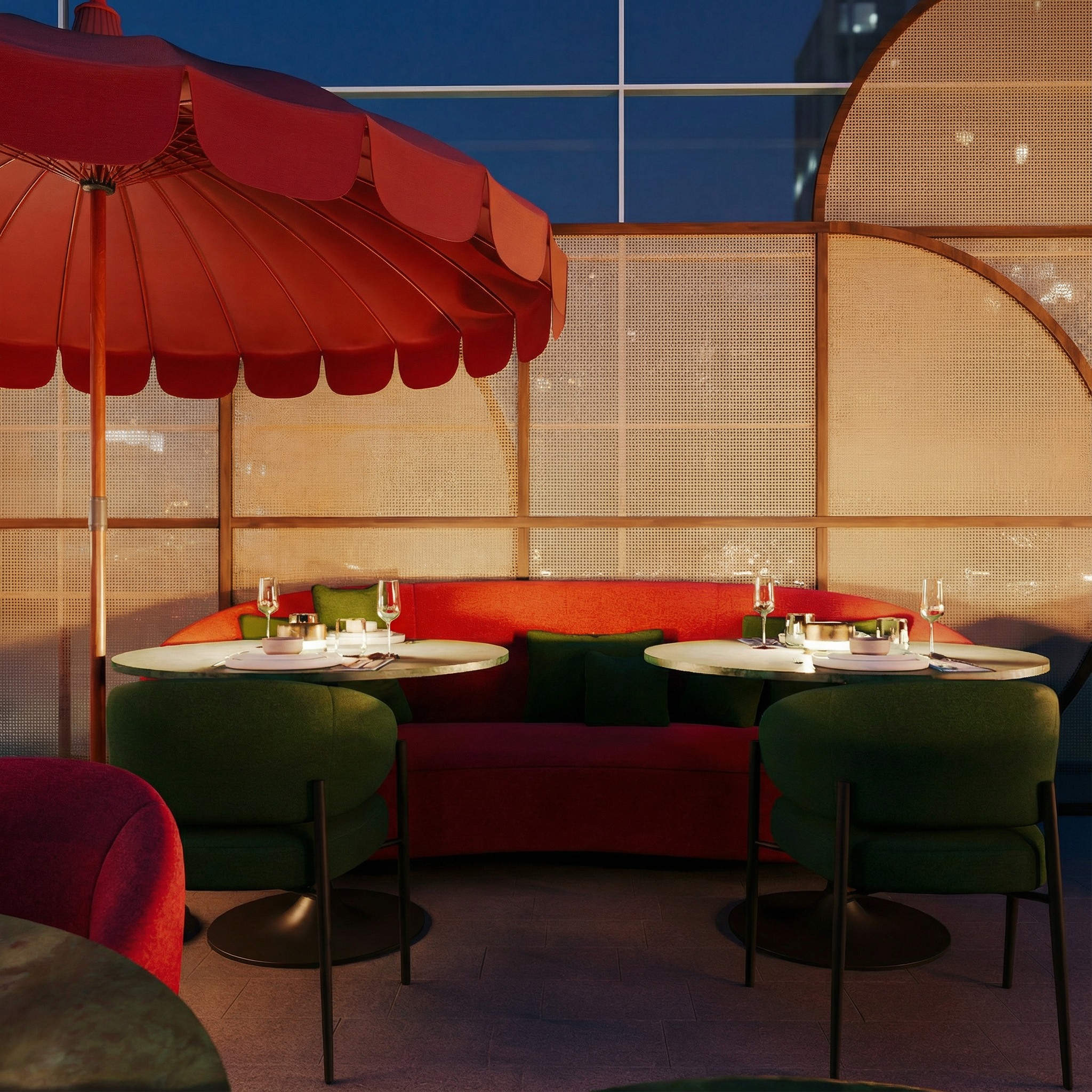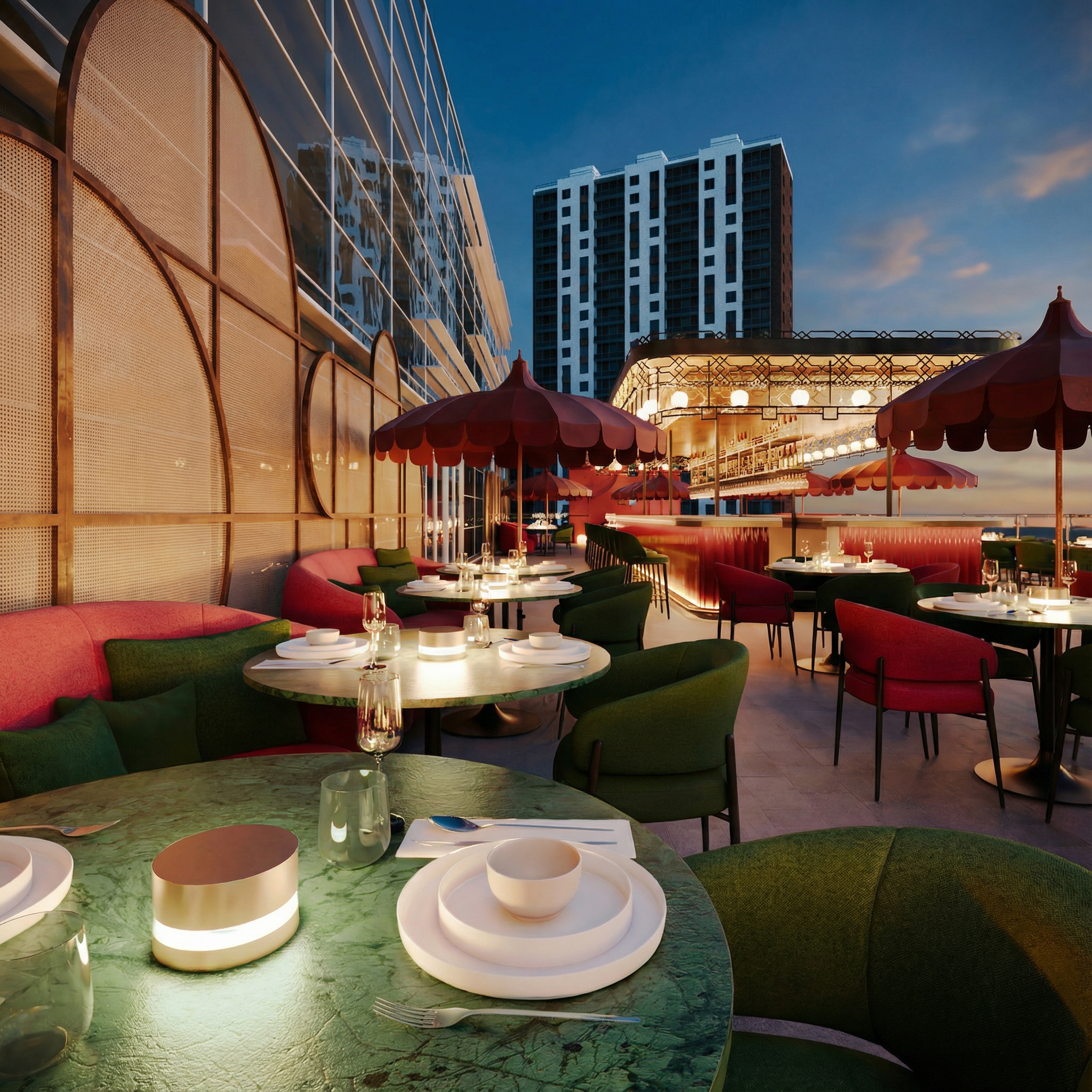 In the décor, luxury is expressed through a rich palette of textures and deep colors, where the fabric of the chairs in emerald green and burgundy contrasts with the nobility of the green marble tables. The environment is punctuated by iconic red parasols and wicker partitions, introducing an organic and nostalgic touch that softens the contemporary lines of the designer furniture.