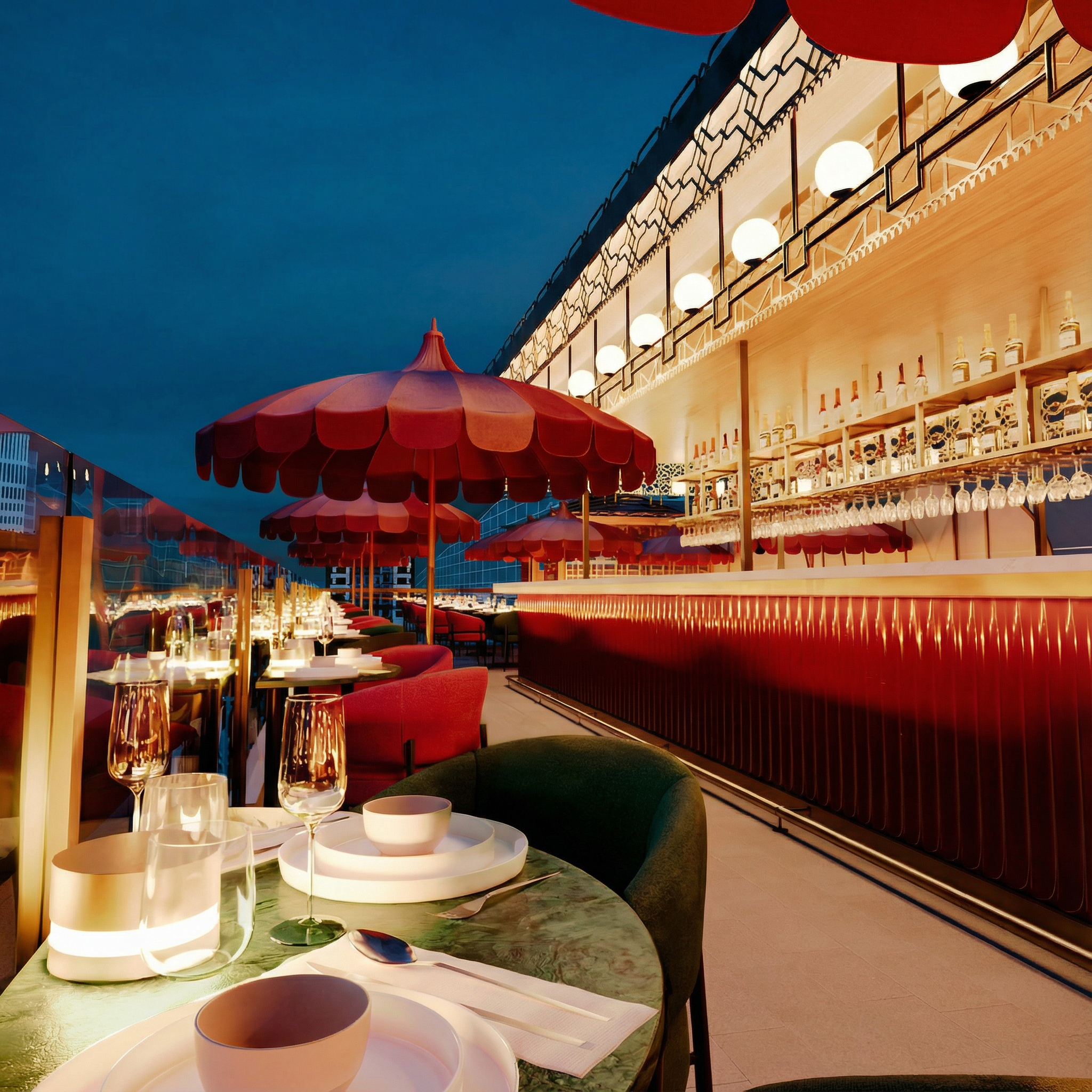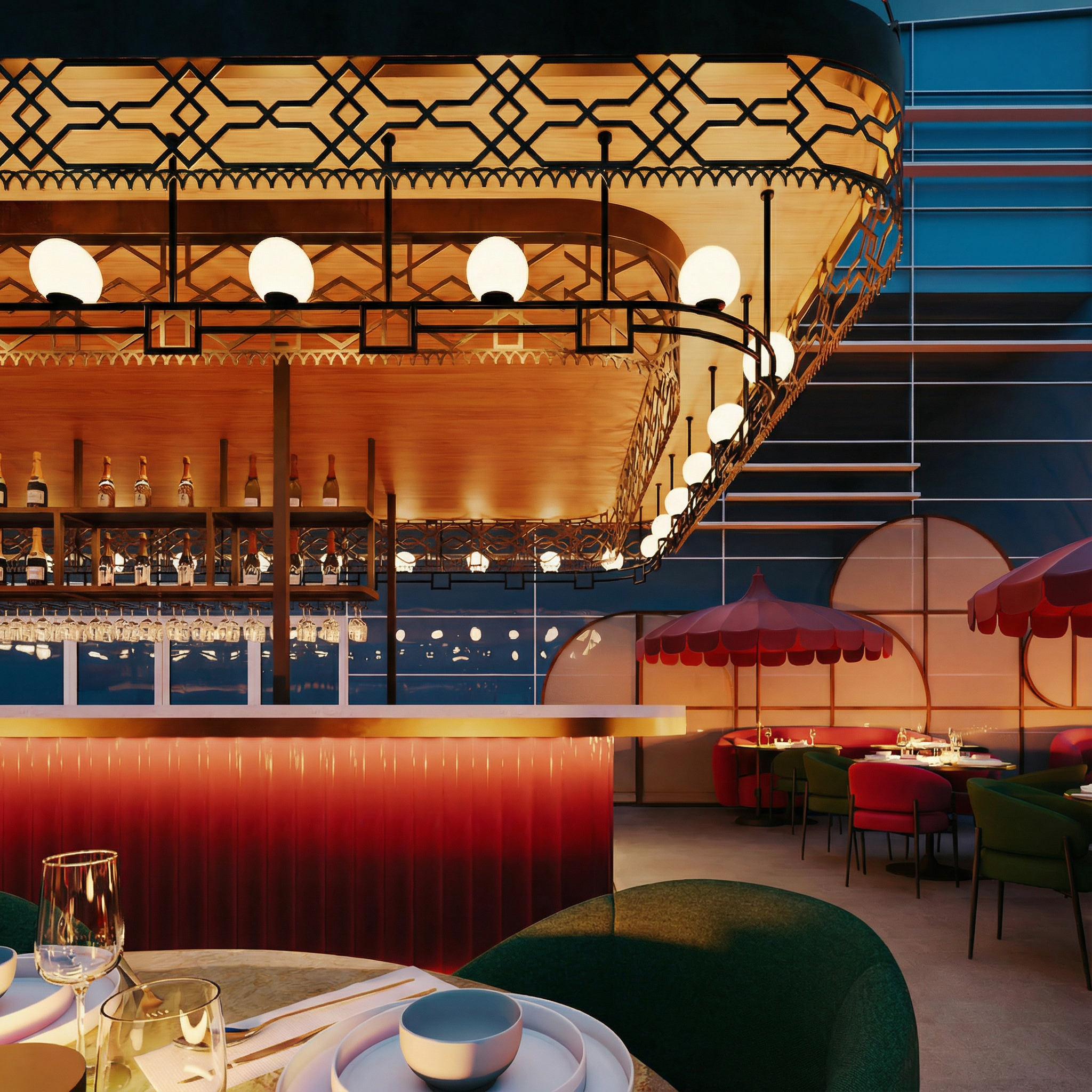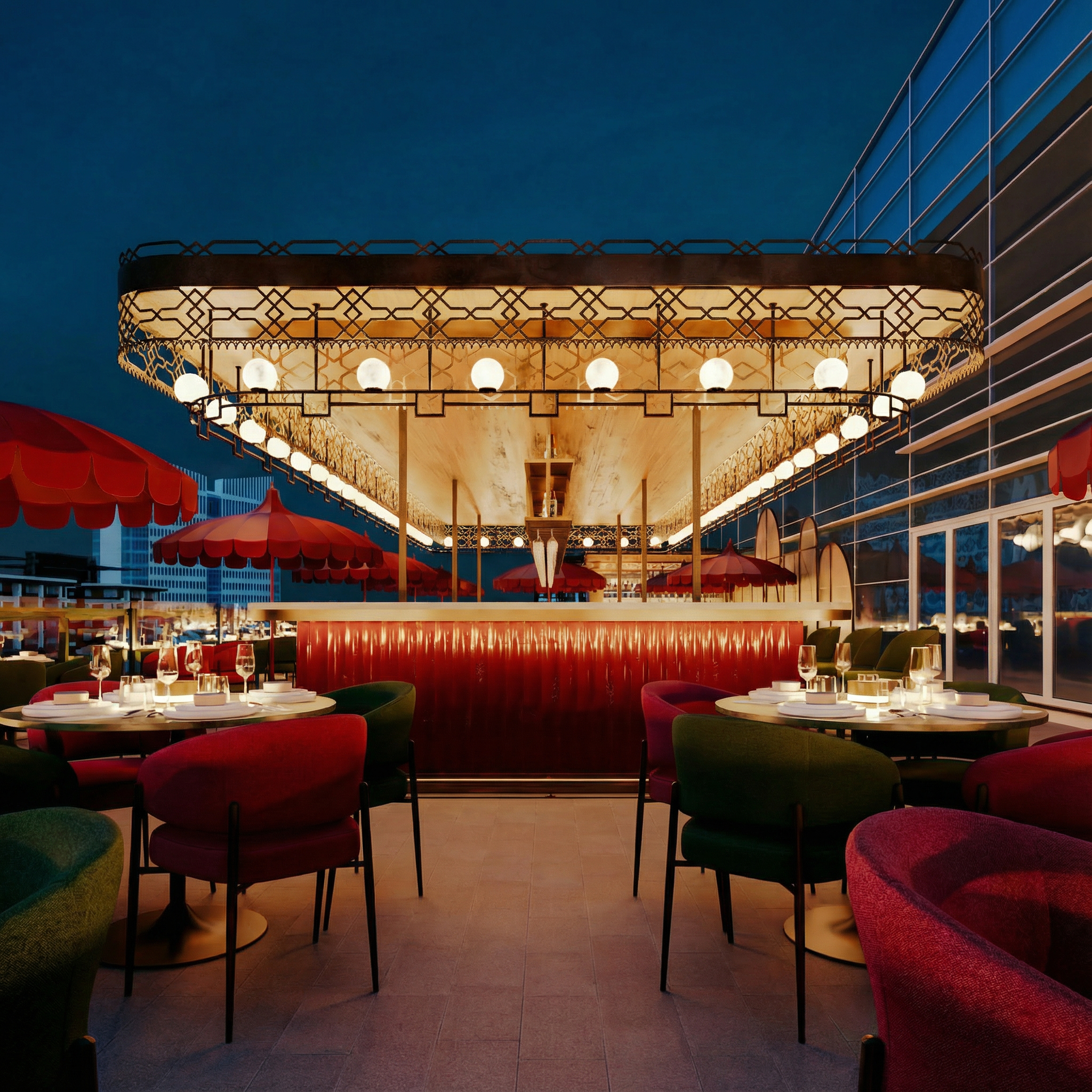 AMANI is a celebration of geometric elegance, defined by golden pavilions with intricate lattices that evoke a modern fusion of Oriental style and Art Deco. These structures, crowned with soft spherical lighting, function as sculptural lanterns anchoring the space, creating captivating plays of light and shadow that transform the terrace’s atmosphere as night falls.