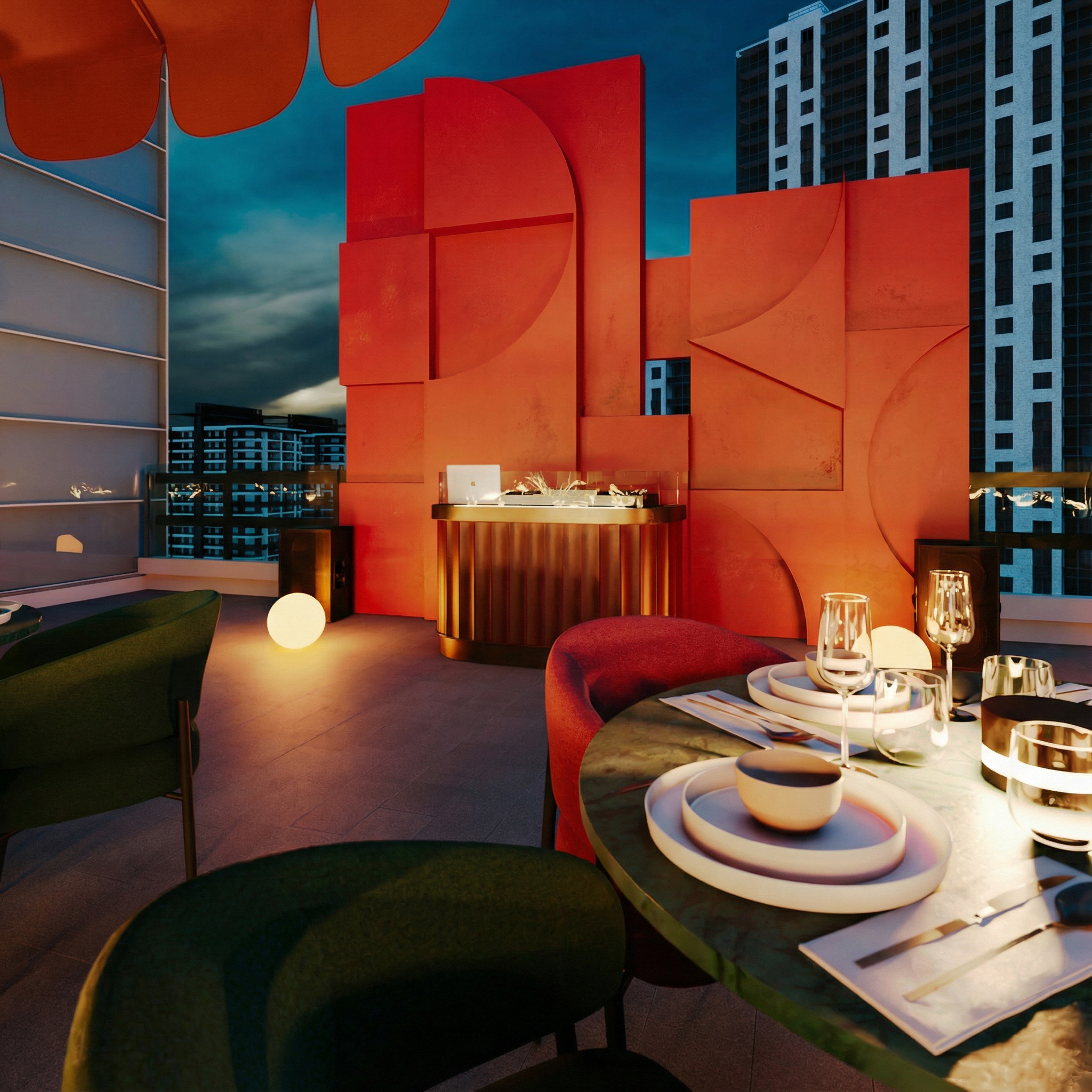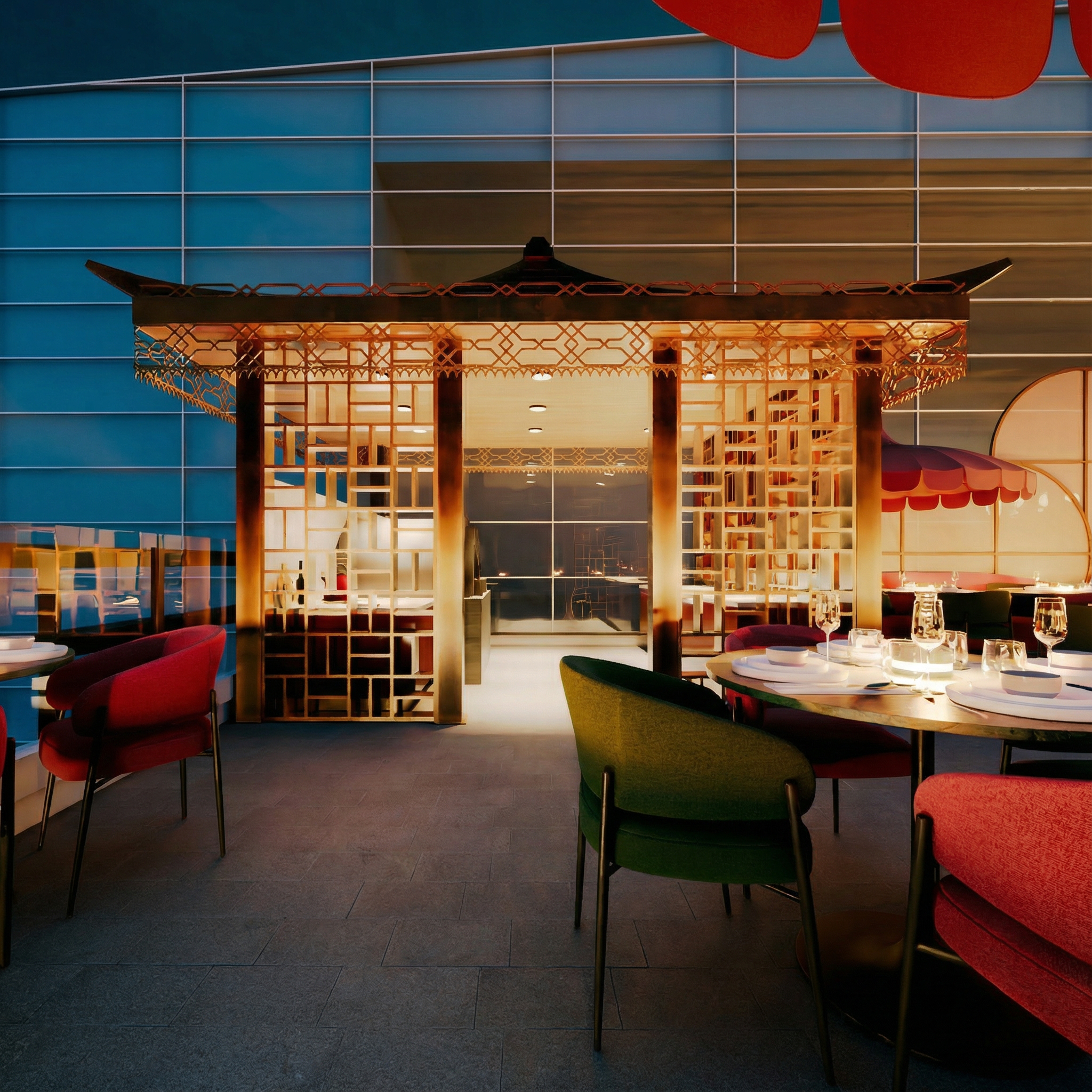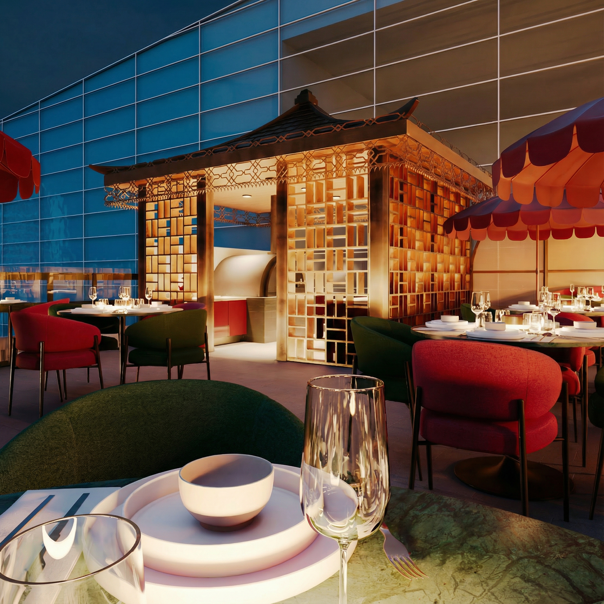 AMANI is a celebration of geometric elegance, defined by golden pavilions with intricate lattices that evoke a modern fusion of Oriental style and Art Deco. These structures, crowned with soft spherical lighting, function as sculptural lanterns anchoring the space, creating captivating plays of light and shadow that transform the terrace’s atmosphere as night falls.
